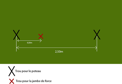 - Le trou du poteau sera espacé de 50 cm de celui pour la jambe de force.