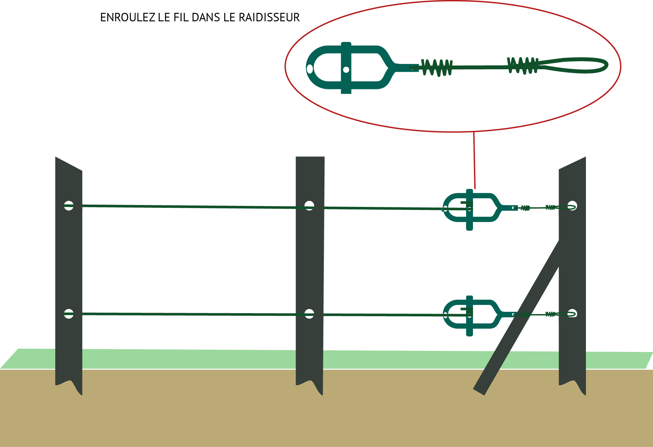 - Les raidisseurs sont à placer tous les 25m pour faire une reprise de tension. Par conséquent, si vous avez une longueur de clôture qui dépasse 25m, vous devrez remettre des tendeurs sur les poteaux intermédiaires.