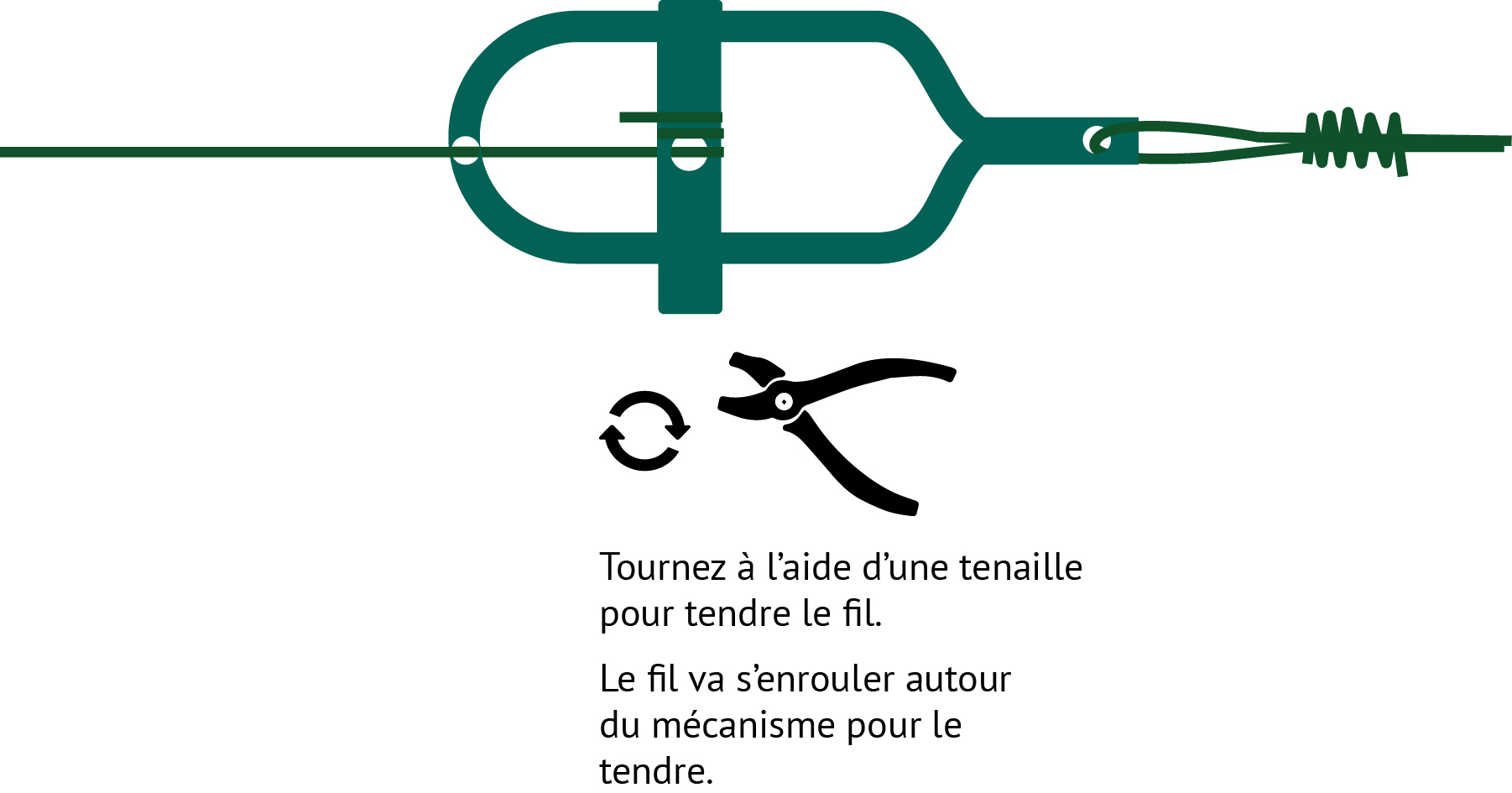 - Une fois sur le poteau d’arrivée, attachez le fil de tension au raidisseur à l’aide d’une tenaille.